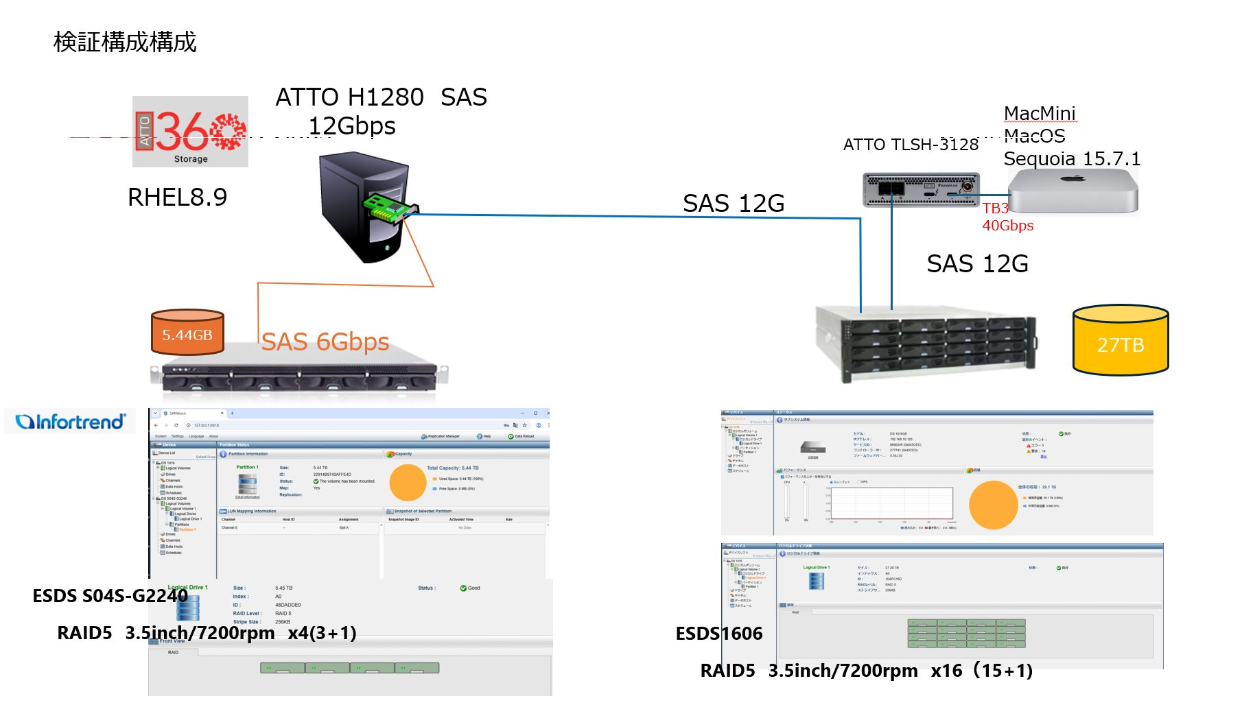 【弊社テスト環境】Windows/RHEL8.9サーバにはATTOのExpressSAS 12GのHBA、MacMiniにはTLSH3128(ThunderLink)を搭載して、SASストレージ(6/12Gbps)に接続しました。