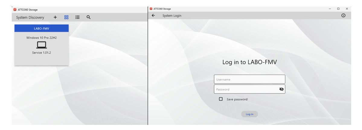 インストールされた、「ATTO360Storage」を起動して、起動している端末のユーザ(Admin 権限)/パスワードでログインしてください。