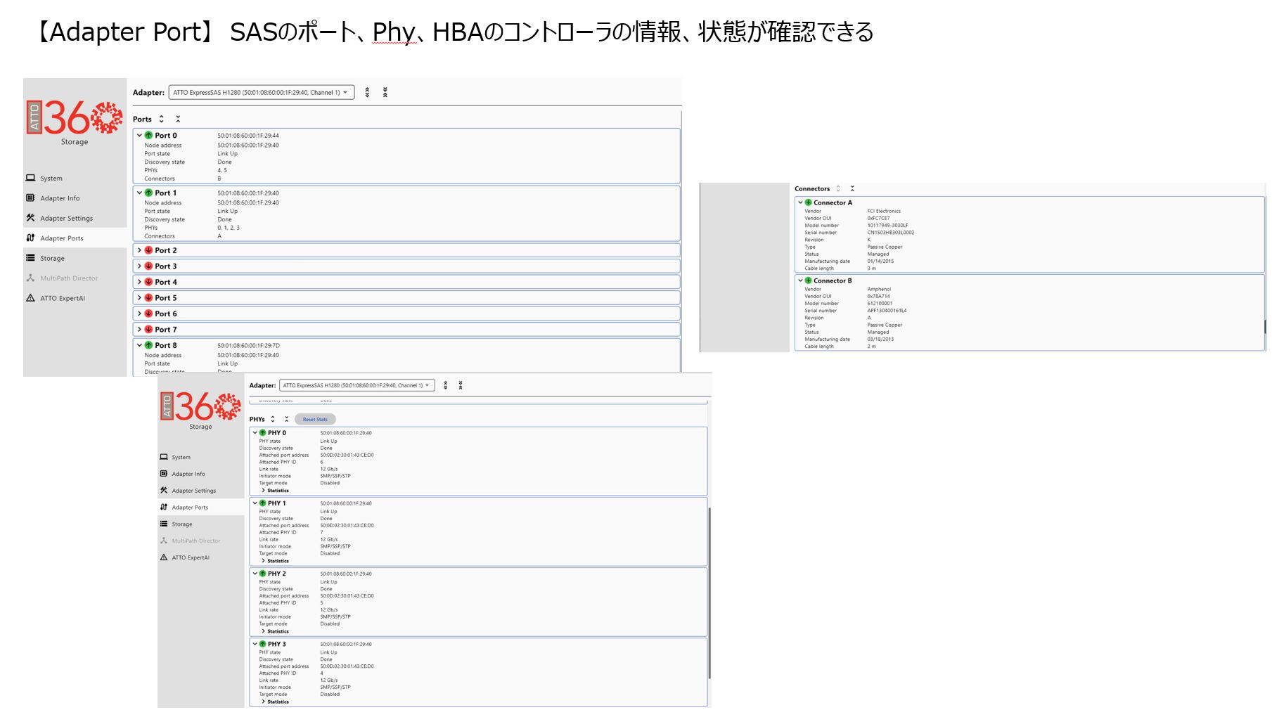 搭載しているHBAのポート、HBAのコントローラの情報、状態が確認できます。