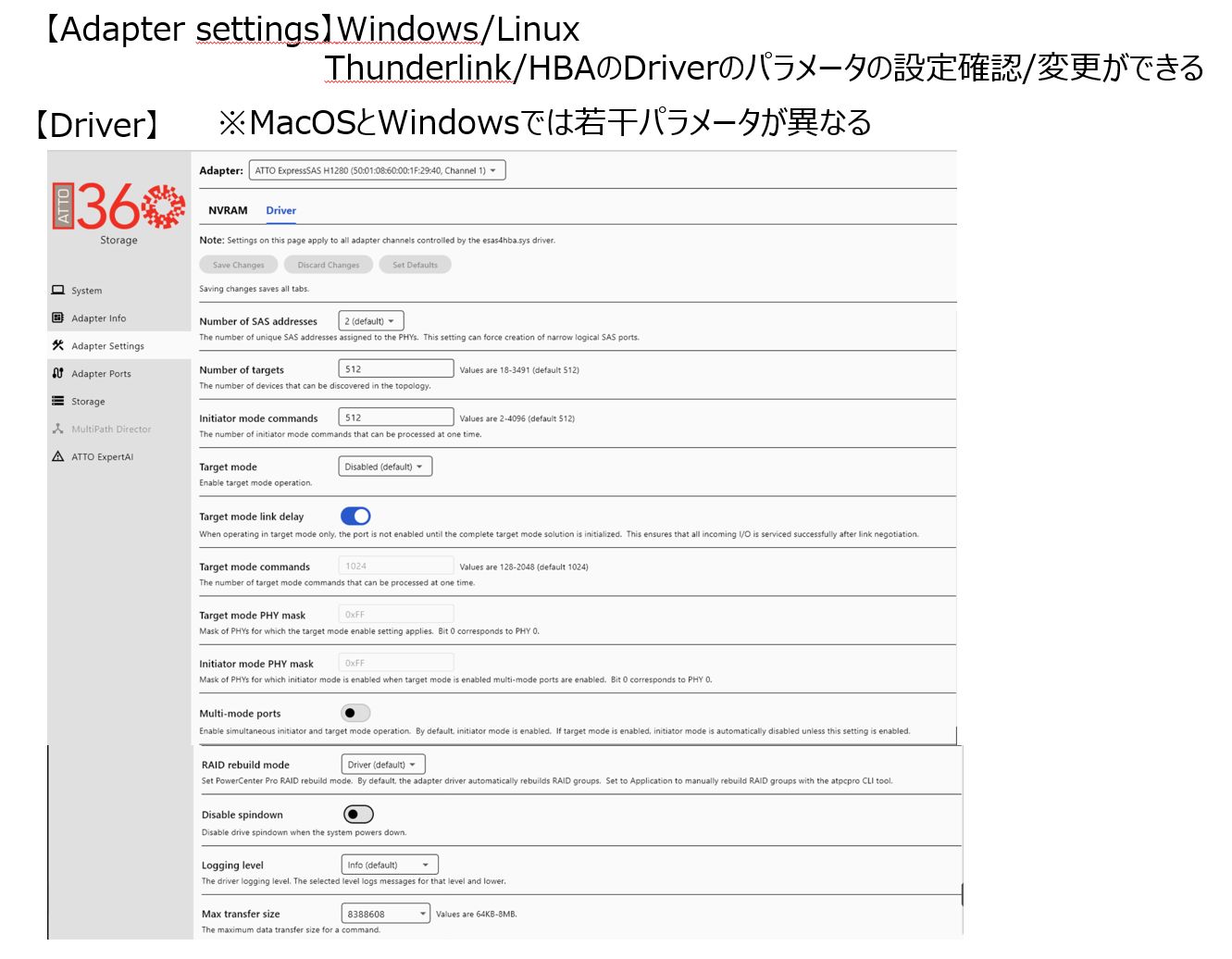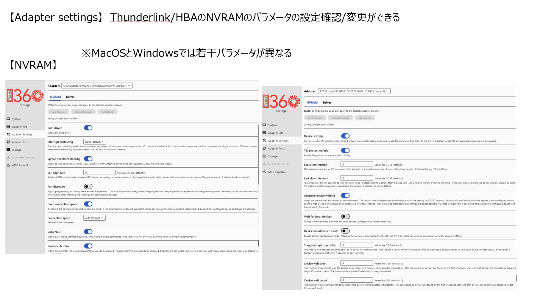 NVRAM/Driverのパラメータの確認と設定ができます。※Windows/Linux とMacOSではパラメータが若干違います。