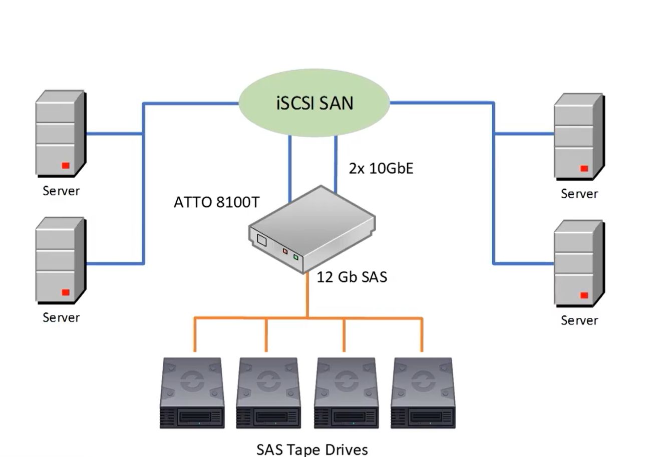 12GーSAS(MiniSAS HD)を1ポート(4SASデバイス)、10Gbps(RJ45・SFP)とEtherentのデータ通信用ポートを2つ、管理用1Gbps(RJ45)1つ装備しており、テープデバイスをETー8100TのSASのポートに接続するだけで、iSCSIネットワーク側にテープデバイスを公開できます。Tapeに特化したモデルになりますので、SASのテープデバイスのみのサポートになります(ストレージを接続しても認識できません)