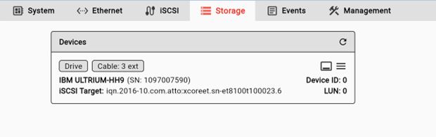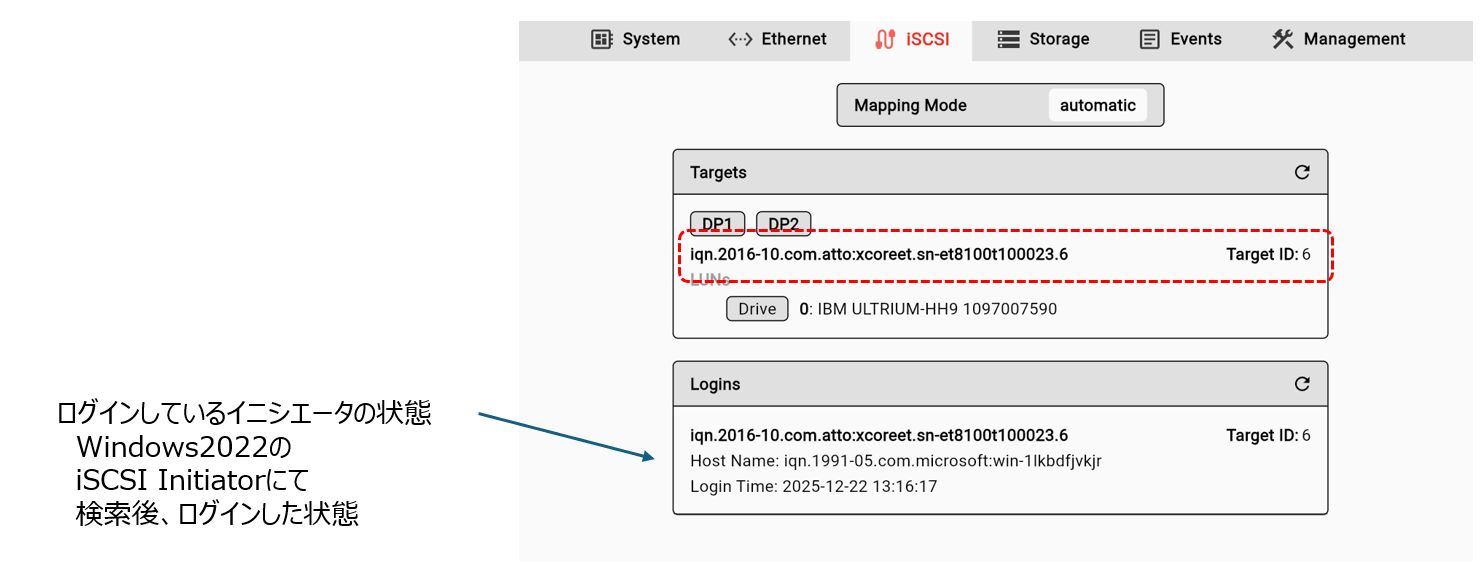 ET-8100TのSASポートにLTO-9を接続すると、「iSCSI」タブの”Mapping Mode”が”Auto”(Default)の場合は、自動でテープデバイにiqnを割り当てます。