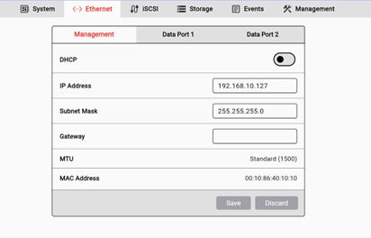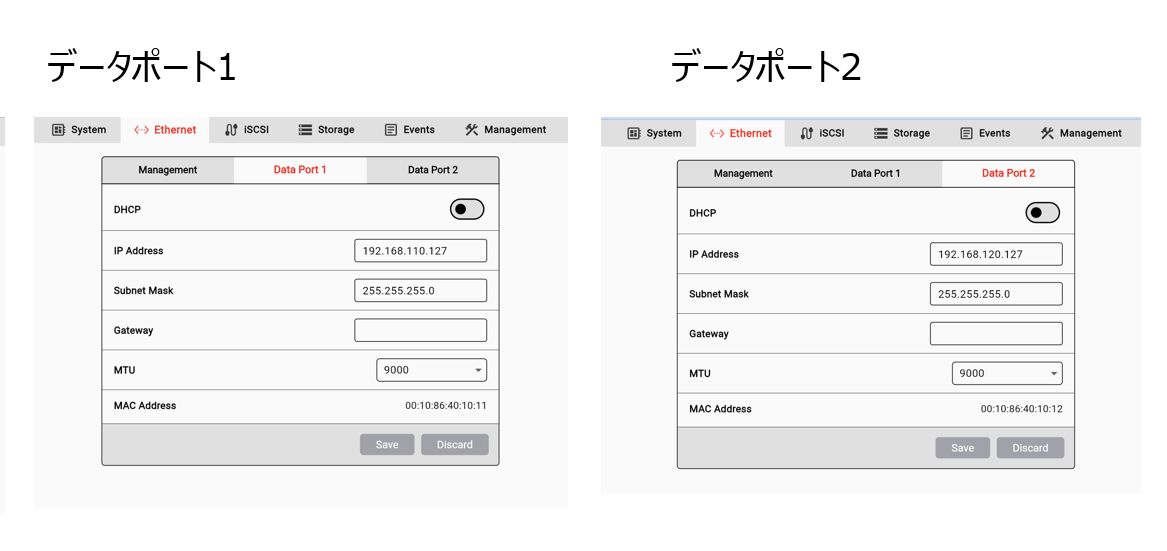 iSCSIポートのIPアドレスを設定します。「Ethernet」タブのDataPoer1/2にて設定します。