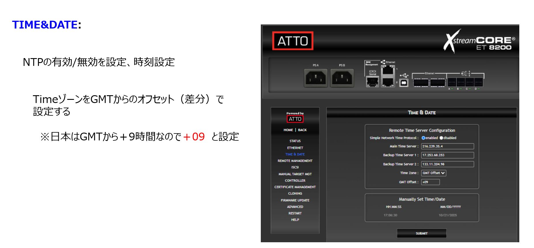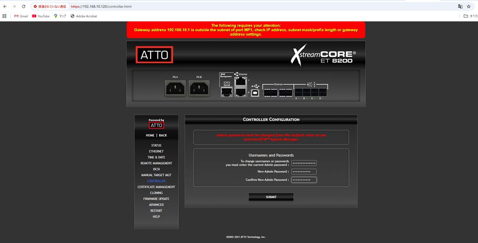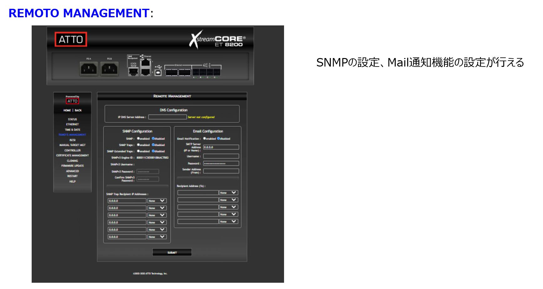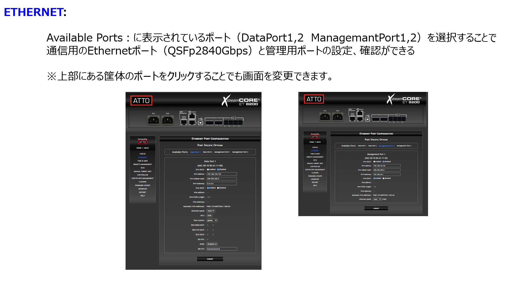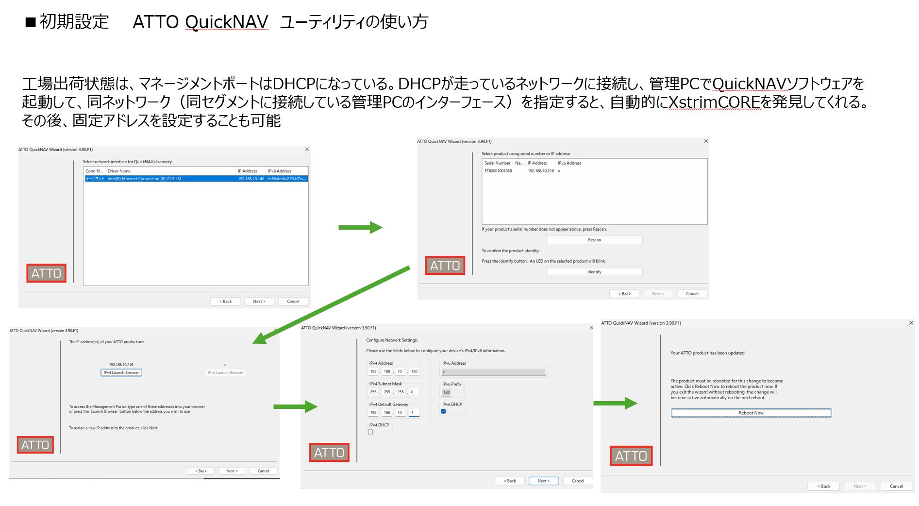 まずは、ETー8200の管理用Ethernetポートをネットワークに接続します。初期設定はDHCPになっているので、DHCPが走っているネットワークにて、ATTO QuickNAVユーティリティを使用して自動的にXstreamCOREを発見させます。