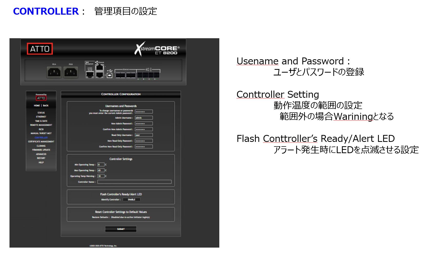 「CONTROLLER」メニューでは、ユーザの登録、動作温度の閾値の設定、変更やLEDの点灯設定が可能