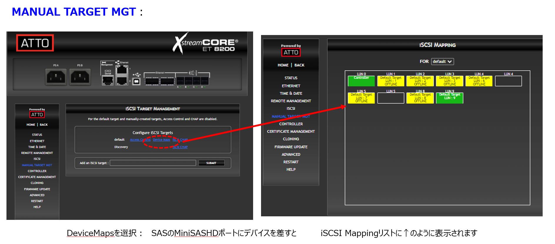SASデバイスのマッピング iSCSI側に公開するデバイスの設定(選択)ができます。