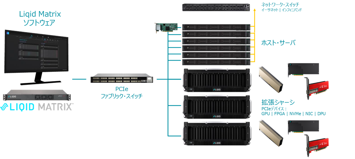 LIQID CDI製品とは、GPUなどのPCIeデバイスをLIQID社専用筐体(拡張シャーシ)に導入し(プール化)、PCIeファブリック・ネットワークを介して接続した複数のホスト間で共有(タイムシェア)できるようにする技術製品です。