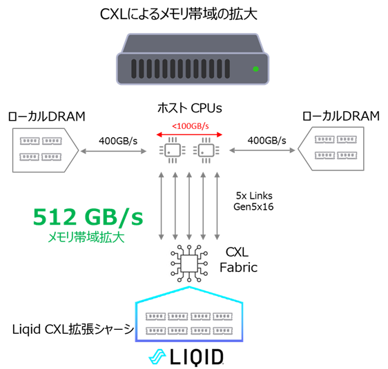 CXLメモリを採用してサーバのメモリ容量を拡張する場合、サーバ本体のPCIeスロットに導入する方法か、或いはLIQID製品のように外部の専用筐体(LIQIDではCXLメモリ拡張シャーシと呼ぶ)にCXLメモリデバイスを搭載する方法があります。後者は、CXLメモリの外部プールを構築し、CXLファブリック・ネットワーク(物理層はPCIeファブリック)を介してサーバとCXLメモリ・プールを接続するという方法です。どちらの拡張方法でも、サーバ内部のメモリスロットの帯域は共通ですが、CXLメモリデバイスを追加することによりシステム全体のメモリ帯域が拡張されることになります。下図は、LIQID CXLメモリ拡張シャーシを用いてCXLメモリ・プールを構築し、サーバと接続した場合の概念図です。拡張シャーシの背面にはPCIe x16外部ポートが5ポートが装備されており、そのポートを介してサーバ(に搭載されるCXLホストバスアダプタ)と接続することができます。概念図では全5ポートを1台のサーバと接続し、最大で512GB/sのメモリ帯域が拡大されることを示しています。