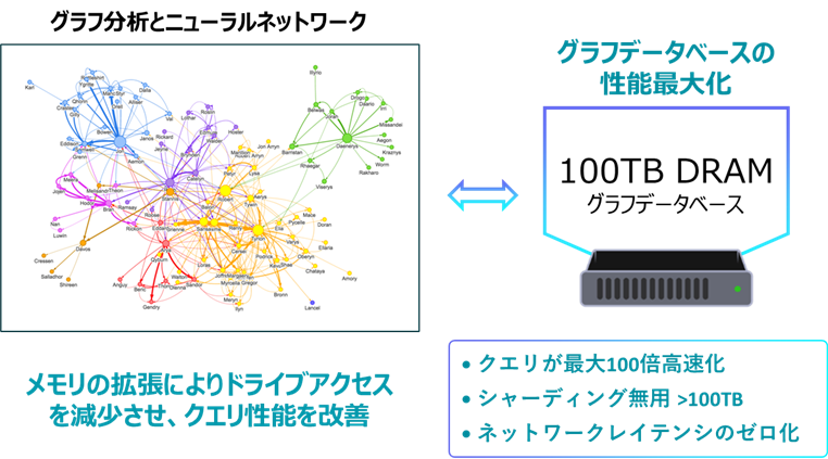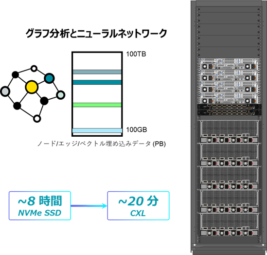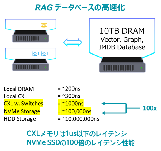 1台のサーバに100TBのCXLメモリを接続し、従来NVMe SSDに格納されDRAMとの間でI/O処理されていたデータをCXLメモリ上に展開することで、クエリが最大100倍高速化されました。また複数台のサーバをクラスタリング接続するためのネットワークが不要となりレイテンシ・ペナルティもありません。